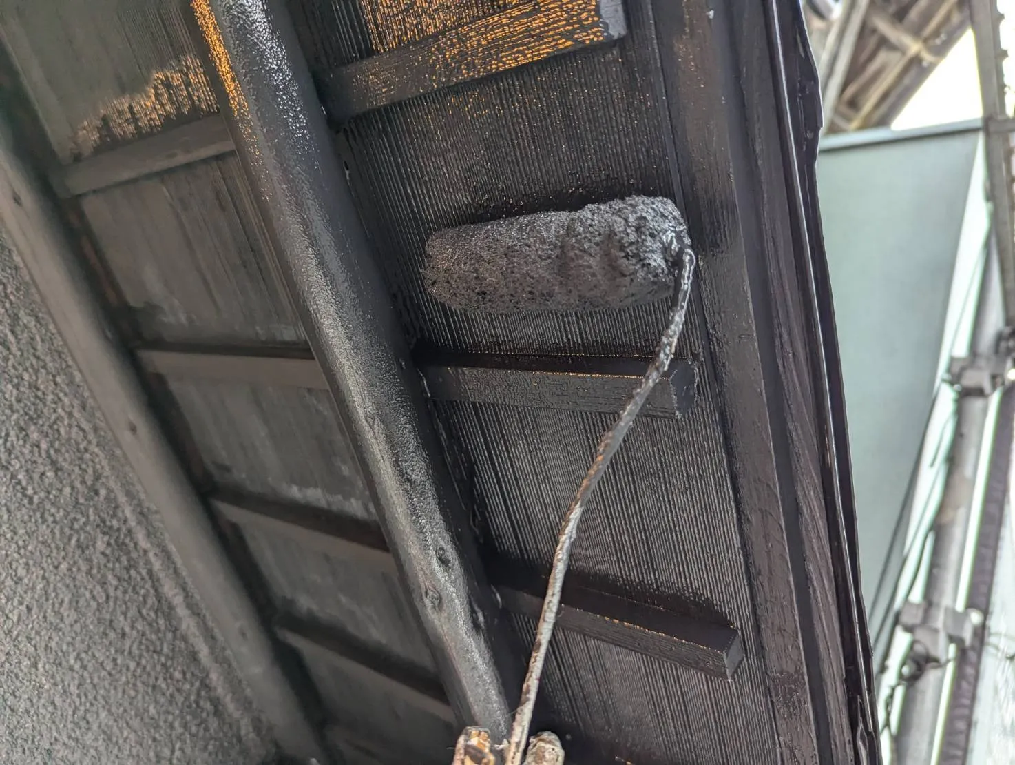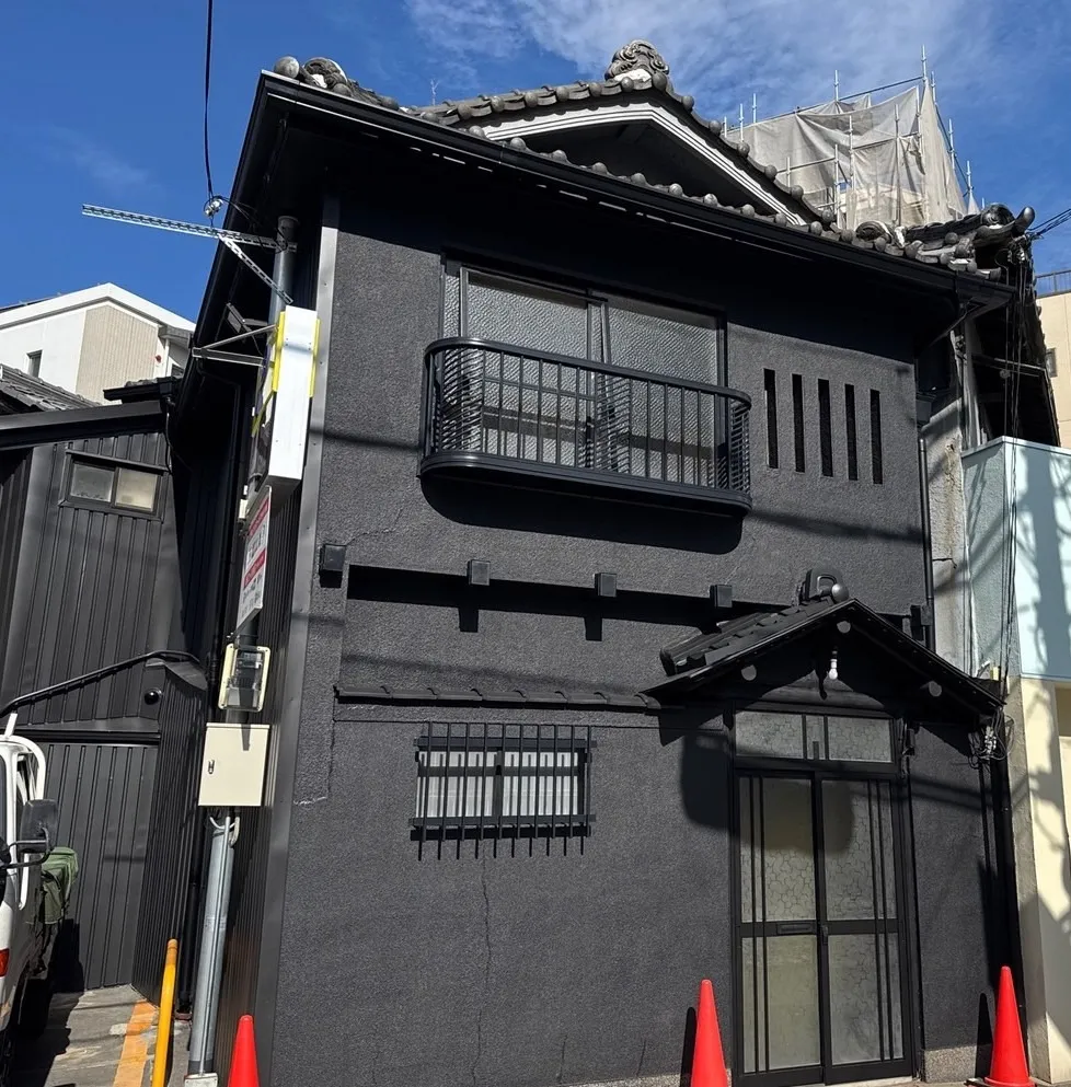 ご希望に合わせ、全体を黒で統一。紫外線や風雨に強く、長期間美観を保てる安心の外壁塗装で、これからの活用にも心強い仕上がりです。真っ黒な漆喰の外壁は、重厚感と現代的なスタイリッシュさを兼ね備えつつ、和風建築の趣あるシルエットと調和し、街並みに溶け込む“静かな存在感”を放ちます。また、ワントーンでまとめたことで、今後のテナントサインや植栽、照明なども映える背景に。外観の自由度も広がりました。お客様からは「見違えるようにきれいになった」と嬉しいお言葉をいただきました。この場所に、また新たなストーリーが生まれていくことを願って──